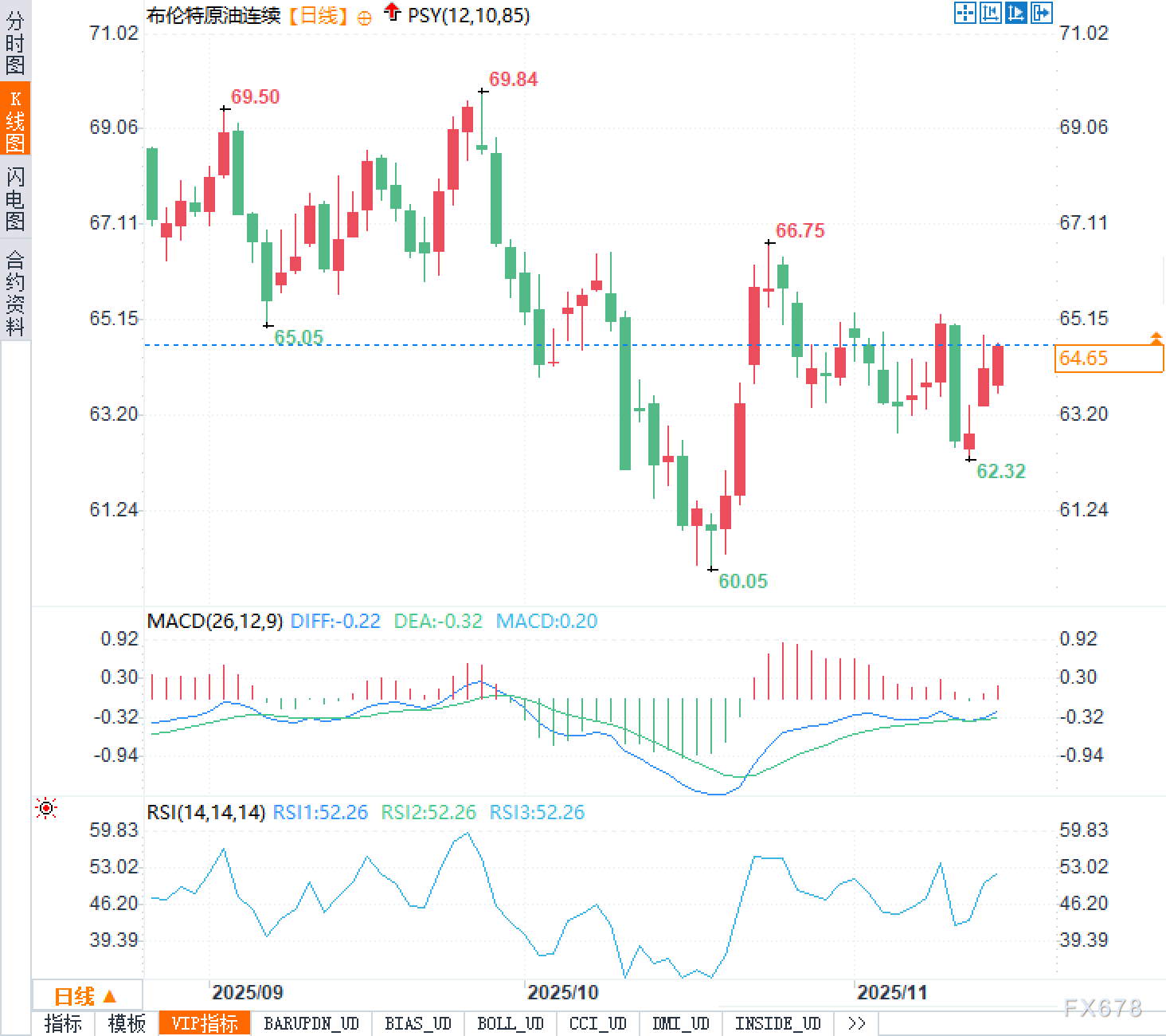 汇通财经APP讯——11月17日,星期一。当前全球大宗商品市场在高利率环境与地缘局势交织之下,风险情绪与基本面信号此消彼长。能源板块仍是定价的核心主线之一,布伦特原油在供给扰动与中期宽松预期的拉扯中反复震荡。布伦特原油价格北美时段位于每桶64.65美元附近,处于并不极端但风险溢价逐步抬头的区间。