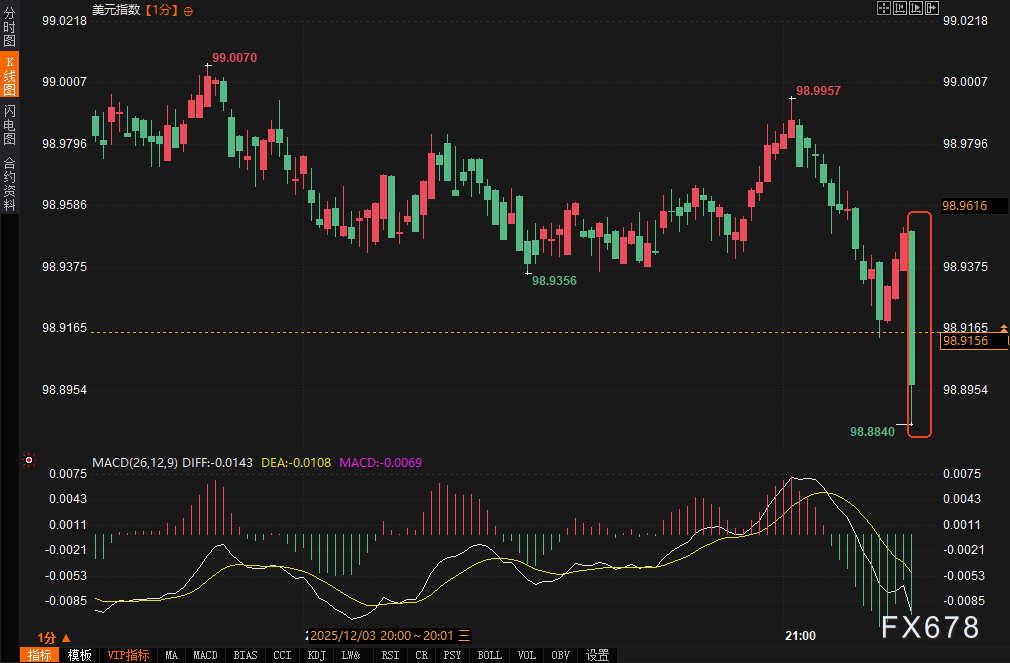 汇通财经APP讯——周三(12月3日)北京时间21:15,美国ADP就业报告公布,私营部门11月新增就业岗位减少3.2万个,远低于市场预期的微增1万。这是自2020年6月以来最差单月表现,显示劳动力市场下行压力加大。数据公布后,市场对美联储降息的预期显著上升,美元指数短线下挫约8个点,最低触及98.8840;现货黄金短线拉升近10美元/盎司,最高报4221.25美元/盎司。美股期货波动有限,但避险情绪主导盘中走势,投资者关注这一数据对宏观政策路径的影响。