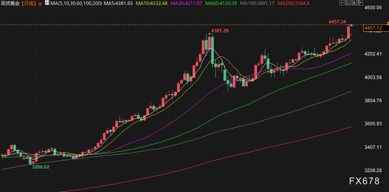 周二(北京时间12月23日)亚市早盘,现货黄金交投于4457美元/盎司附近,受地缘政治紧张局势加剧与市场预期美国20