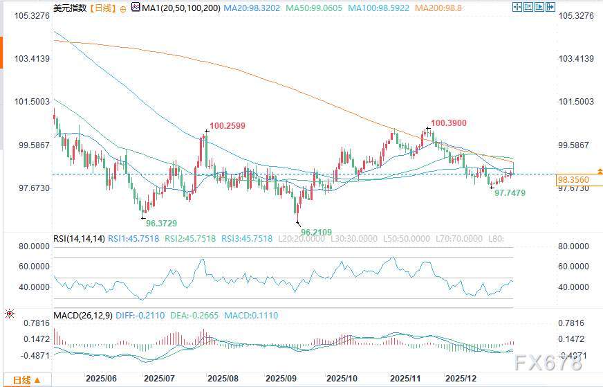 周一(1月5日)美盘时段,美元指数开盘走高,但随后几乎回吐全部涨幅。早盘时段,避险买盘推动美元汇率飙升至98.861,刷新12月10日以来峰值。不过,在早盘冲高之后,美元指数回落至日内低点98.471。